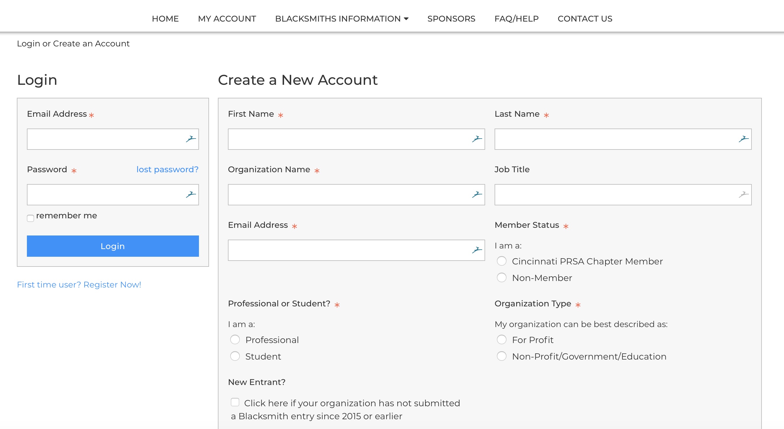 Note: If you set up an account to apply for a Blacksmith Award since 2019, your account is active. You should login with those credentials and skip to step 2. If you don't remember the password to log in, click 'lost password' in the login box to begin the password reset process.
